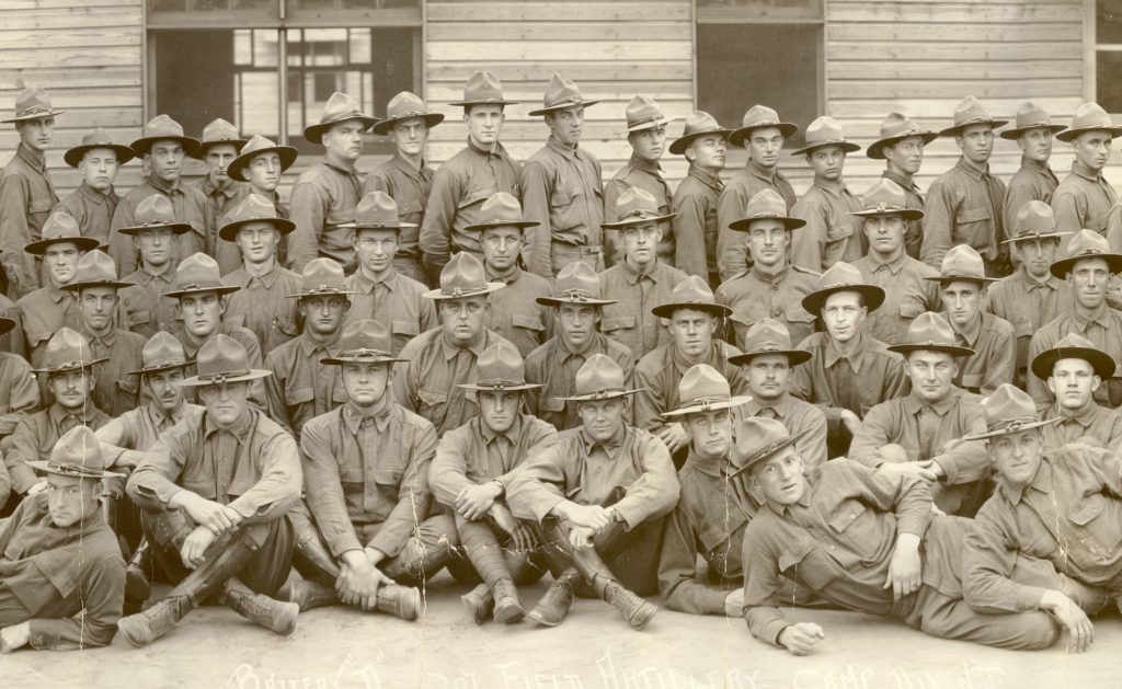 Most of the members of the first two contingents of WWI draftees from Genesee, Orleans, and Wyoming counties—over 160 men in all—are in this photo, taken in October 1917. About 85 are from Genesee County, 30 from Orleans County, and 50 from Wyoming County.