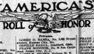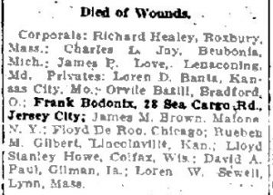 Frank Bodonix appears on two published Genesee County honor rolls and is listed as a Genesee County soldier in the State of New York’s Roll of Honor. On that roll, and on his NYSS, Bodonix’s town of residence is given as LeRoy, New York. County Honor Roll Lists 2 and 3, which were largely based on the Roll of Honor, also list Frank Bodonix as a LeRoy soldier.
