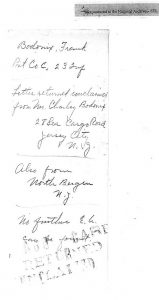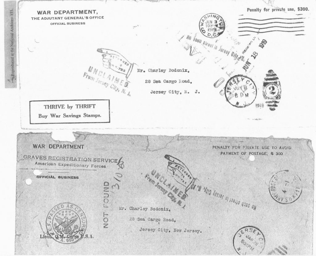 Research failed to confirm or disprove Bodonix’s residency in either place. No mention or evidence of any Bodonix was found in LeRoy or Genesee County area newspapers, directories, or other source documents from the time. No census records for the period spanning 1890 through 1920 were found for any Bodonix in New York or New Jersey. In addition, documents in Private Bodonix’s Burial Case File, including 1919 War Department letters mailed to Frank Bodonix’s brother in Jersey City and returned marked “no such street address,” and also a War Department document dated ten years later (July 20, 1929) marked “Cannot locate any relatives,” indicate that sustained government efforts to locate the Bodonix family or any other relatives were equally unsuccessful. It’s hoped that further research may clarify Bodonix’s status as a New York (whether LeRoy or elsewhere) or New Jersey soldier.