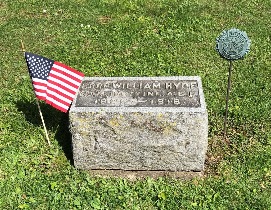 William Hyde was born and raised in Batavia (Genesee County), New York. His mother was Fanny Hyde, who in the 1900 US Census is listed as the head of the household, widowed, living in Batavia with William and four siblings (brothers Milton and Harry; sisters Emily and Celinda). The 1910 US Census shows William’s mother, listed as Fannie, married to Densmore Austin of 23 Hewitt Street in Batavia; William, listed as Willie (stepson), is the only child shown. There is some question regarding William Hyde’s birth year. The 1900 US Census lists him at 2 years old and gives his birth month and year as January, 1898. The 1910 US Census, accordingly, shows him to be 12. This means that Hyde would’ve been only 20 years old when he was killed in September 1918. However, the November 26, 1918 Batavia Daily News article announcing his death says that William Hyde was 23 when killed. Correspondingly, his NYSS gives his age at enlistment in 1916 as 21 (meaning a birth year of 1895), and Elmwood Cemetery records also give his birth date as 1895. Lacking evidence to the contrary beyond the two censuses, his age at death is given here as 23.
