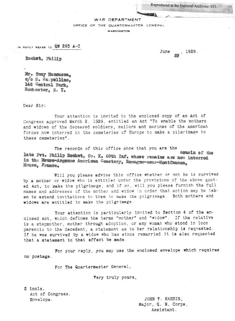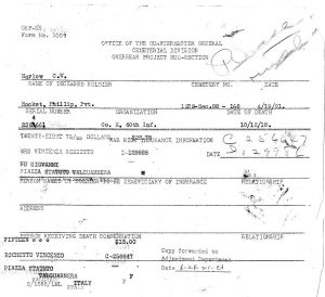 Eventually Rocket’s remains were located and interred at the Meuse-Argonne American Cemetery in Romagne, France. On two documents in his Burial Case File, one from 1920 and the other 1921, the cause of death listed has been crossed out from “missing in action” or “now presumed to be dead” and changed to killed in action.